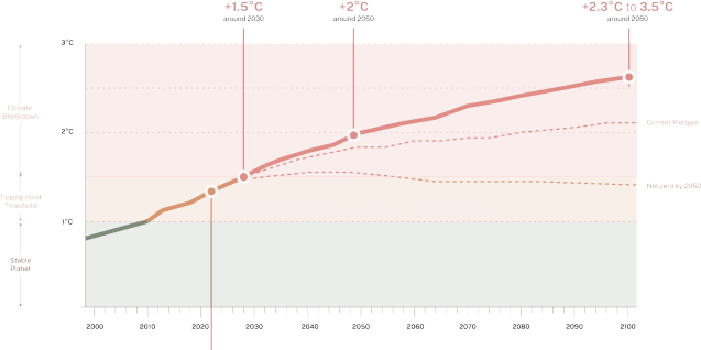 图一、我们处于何种境地?预测的全球平均地表温度(GMST)上升。来历!国际极地委员会(IIPC),国际能源署(IEA),蒂姆·伦顿(Tim Lenton),英国景象形象局(Met Office)2023年是有记实以来最热的一年,很可能至多是过去12。5万年中最热的一年,并临时令全球平均气温升温冲破了1。5℃和2℃的上限。今天出生的人很可能将履历一个至多上升3℃的星球(若是我们轻忽临界点的话,至多如斯)。毫不夸张地说,这是社会解体的根本。洪水将更屡次地发生,形成更大程度的。风暴将变得愈加强烈和屡次,电力线、衡宇和交通联系,每次发生城市使得修复变得愈加坚苦和成本更高。夏日将不只仅是“更热”,它们将变得,而且代表了一种新的全球天气的一个方面,其成果将是可预测的季候和粮食平安的。图二显示,正在气温上升3℃的环境下,地球上的区域将变得不适宜栖身,而英国正在很大程度上依赖这些地域供给食物、能源和其他根基物资。同时,地球上一些最主要的维持全球天气不变的生态系统也位于这些地域,包罗亚马逊、中非和东南亚。这些地域也是估计受陆地温度上升影响最严沉的地舆区域之一。