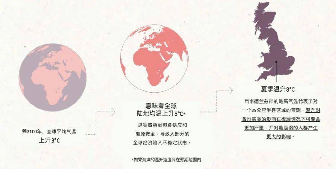 内,因为天气和生态解体,倘若继续连结高排放,英国城市社区当下面对的风险,可能会使全球平均温度提拔3℃。人们屡次的会商论证全球平均气温上升1。5℃或2℃是能够接管的,可是这些变化将对数百万人的生命形成庞大的影响,我们不单愿这类言论将气温上升进一步一般化。很多人对全球平均气温上升+3℃的世界不敢想象而且谈之色变,由于气温上升3℃对世界的影响将是灾难性的,可是倒霉的是,这曾经变成了我们必需理解而且做好预备的事。然而这毫不意味这我们接管和承认那样的将来。我们,布局性及系统性削减温室气体排放,火急需要每小我的勤奋取步履。除了应对地球变暖的后果外,我们还需要积极从头构思我们的社区和经济若何运做。正在本文中我们但愿激发您的客不雅能动性,取我们一路想法子应对这些严重场面地步,我们必需做好最坏的筹算,并为成立一个全新且有但愿的将来而勤奋。从正在撰写本文时,全球平均地表温度(GMST)连结正在1。3℃,并正朝着十年之后永世性冲破1。5℃1。5℃,是《巴黎协定》中商定的阈值,也是几乎所有净零排放打算的根本,代表了我们最雄心壮志的天气方针,然而,这曾经是一个数百万人生于风险之中的温度,并且跨越这个,的变暖将难以节制。
