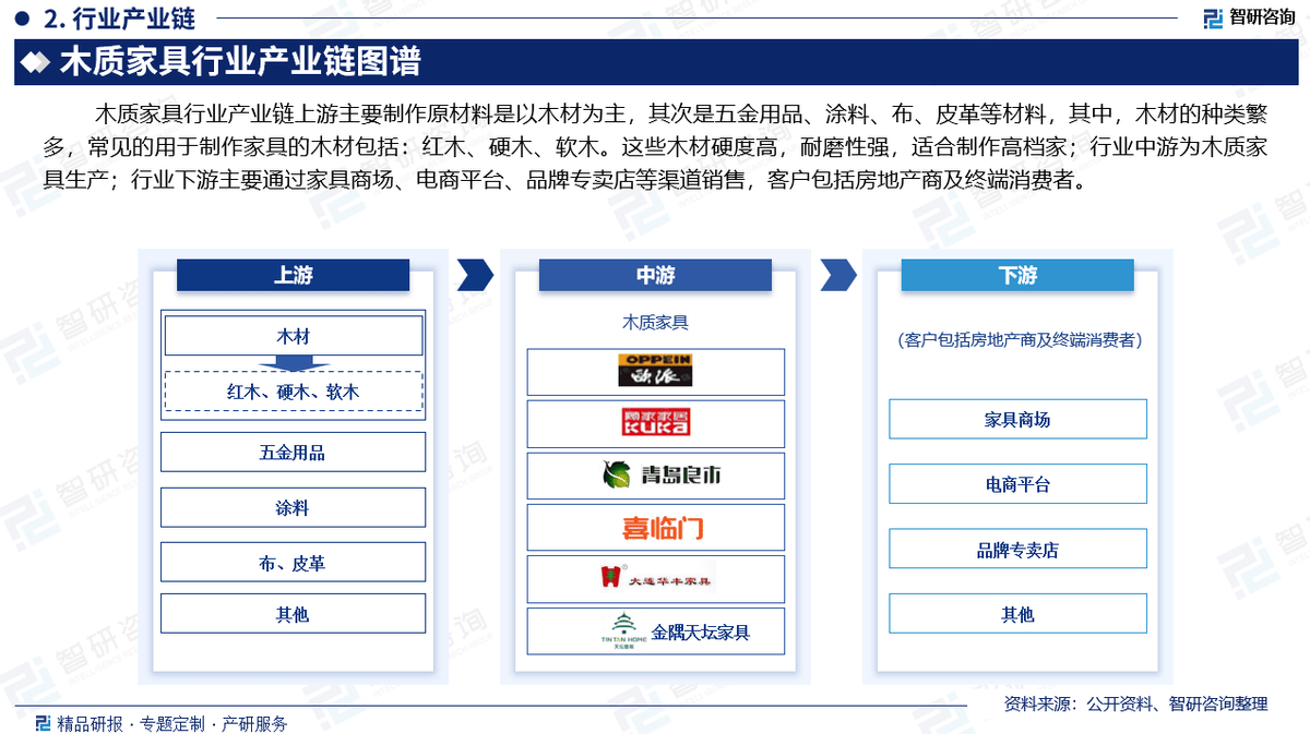 木质家具行业财产链上逛次要制做原材料是以木材为从,其次是五金用品、涂料、布、皮革等材料,此中,木材的品种繁多,常见的用于制做家具的木材包罗:红木、硬木、软木。这些木材硬度高,耐磨性强,适合制做高档家;行业中逛为木质家具出产;行业下逛次要通过家具商场、电商平台、品牌专卖店等渠道发卖,客户包罗房地产商及终端消费者。