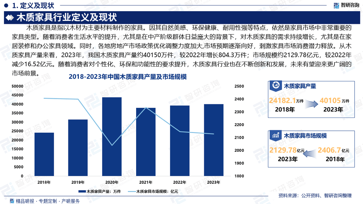 家具行业产物包罗各类床、桌、椅、凳、柜、箱、架、沙发、屏风等。按材质的分歧,行业产物可分为5大类:木质家具;竹、木质家具是指以木材为次要材料制做的家具。因为木材天然的纹理、美妙的外不雅以及优良的可加工性,木质家具界各地都有着普遍的使用,而且常常被认为是保守和典范的家具类型。木质家具因其天然美感、环保健康、耐用性强等特点,仍然是家具市场中很是主要的家具类型。跟着消费者糊口程度的提拔,特别是正在中产阶层群体日益复杂的布景下,对木质家具的需求持续增加,特别是正在家居拆修和办公家具范畴。同时,各地房地产市场政策优化调整力度加大,市场预期逐步向好,刺激家具市场消费潜力。从木质家具产量来看,2023年,我国木质家具产量约40150万件,较2022年增加804。3万件;市场规模约2129。78亿元,较2022年削减16。52亿元。跟着消费者对个性化、环保和功能性的要求提拔,木质家具行业也正在不竭立异和成长,将来无望送来更广漠的市场前景。