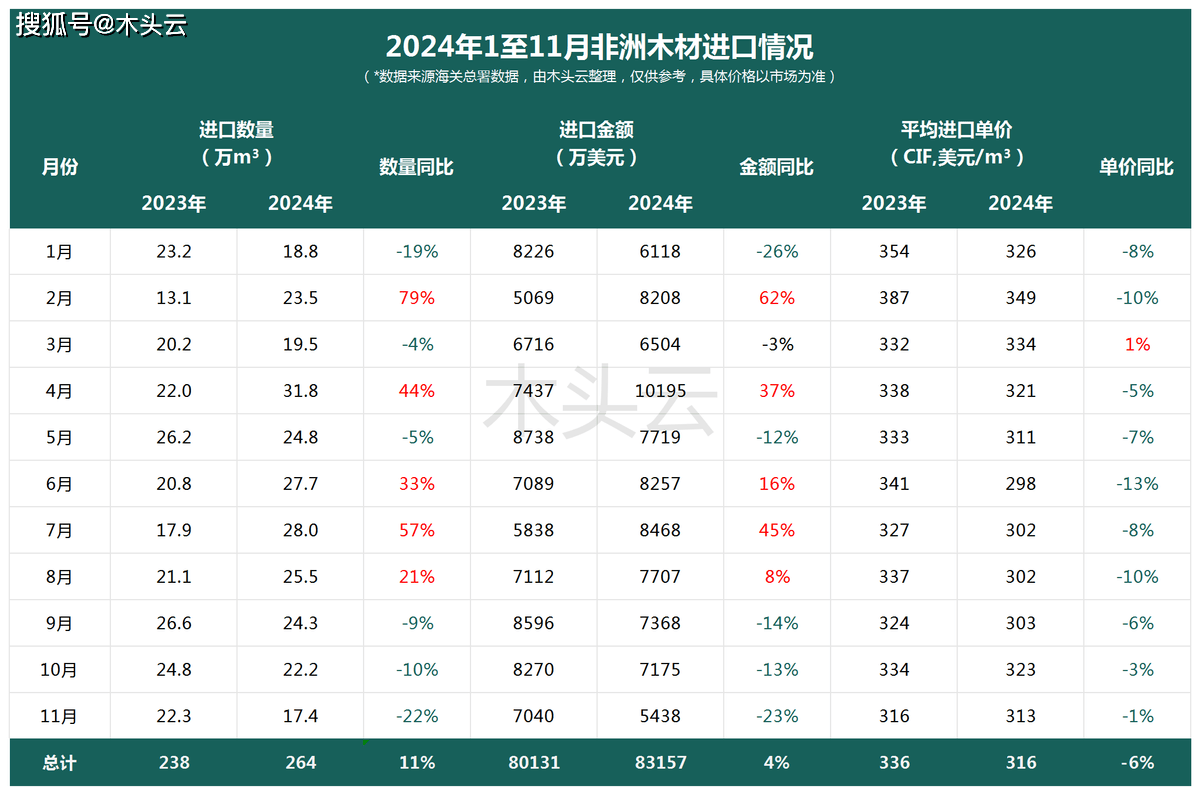 值得留意的是,2024年以来,非洲木材的进口单价一曲维持正在低于2023年同期的程度。虽然11月的进口平均单价降幅有所收窄,但仍比2023年同期下降了1%。从进口布局来看,非洲原木和锯材的表示呈现两极分化。数据显示,具体而言,11月非洲原木的进口量大幅下滑至9。63万立方米,取2023年同期比拟削减了44%,平均进口单价也下降了8%。比拟之下,非洲锯材的进口量则实现了显著增加,11月的进口量高达7。7万立方米,同比增加了58%,但其平均进口单价也下降了12%。