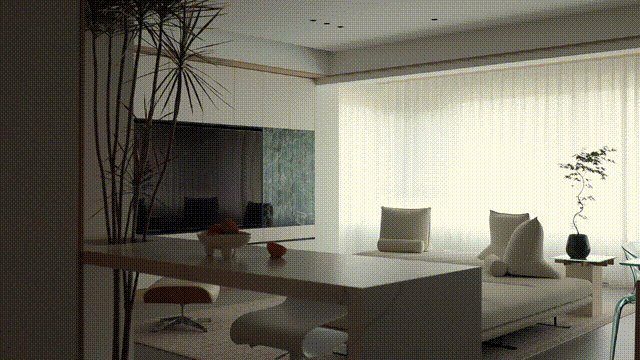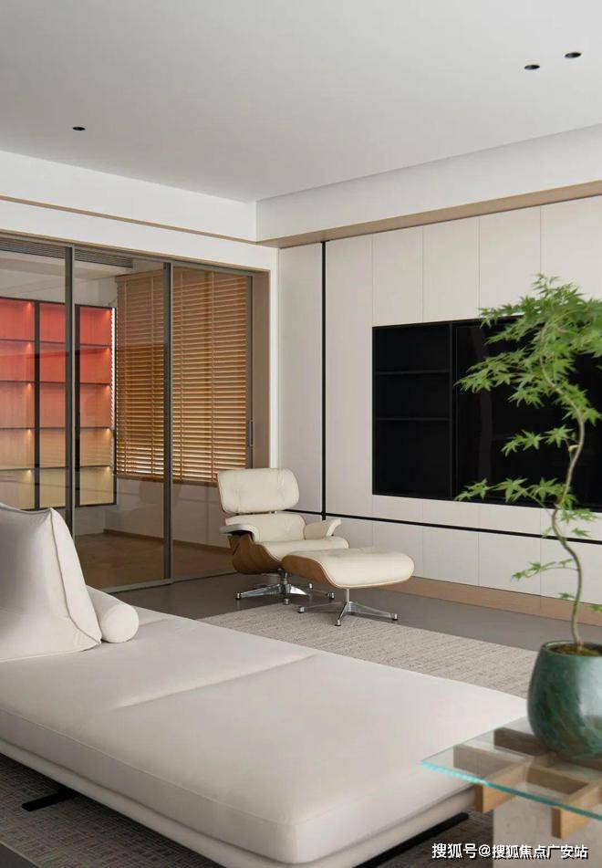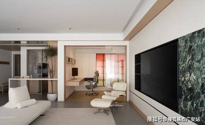 景不雅阳台纳入室内,空间无过多陈列,电视墙操纵取乳胶漆同色系定制储物柜,构成面取面之间利落简练的次序感。