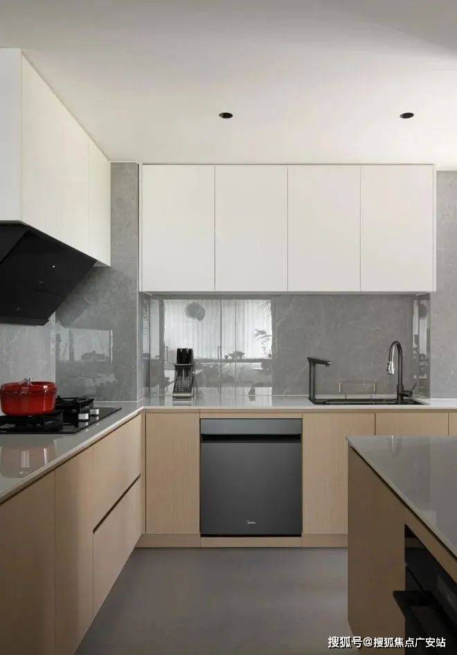 厨房取糊口阳台归并,扩大了操做台面。正在厨房外部新建了一个西厨岛台区域,便利夫妻俩正在忙碌的晚上快速完成早餐并就近用餐,节流了时间。