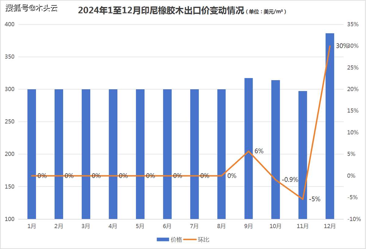 前8个月,印尼橡胶木出口价均维持正在300美元/立方的程度,9月出口价略微上调6%至317美元/立方,10月和11月持续下调,此中11月成为全年最大程度。猜测遭到泰国暴雨影响橡胶木原料供应,以及全球橡胶价钱大涨,12月马来西亚橡胶木出口价达到全年最高程度,同比增加28。6%至386美元/立法,环比11月上涨了30%。