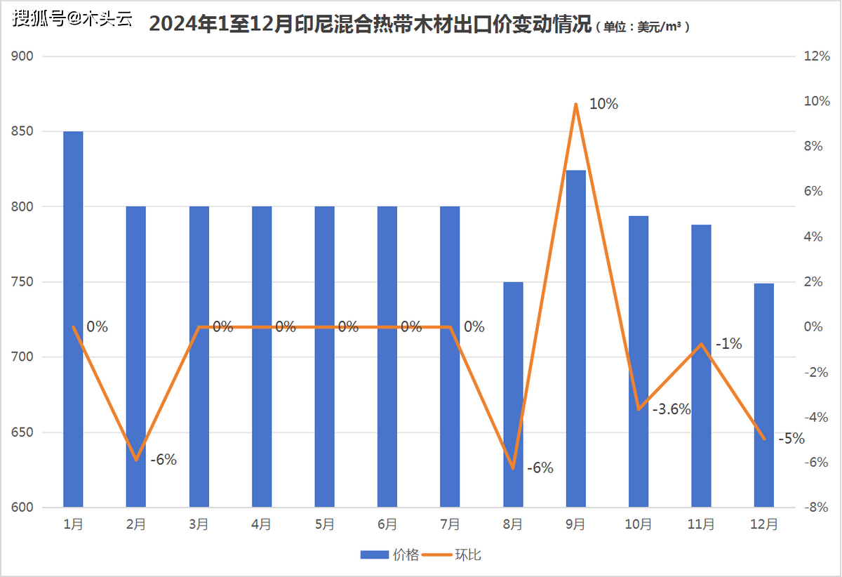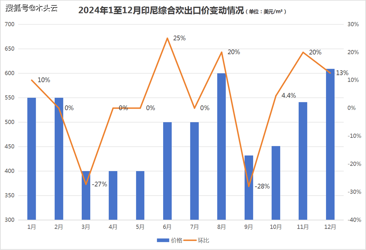 2024年印尼分析欢出口价表示较为波动,最低价呈现正在3月,环比增加13%至609美元/立方。其余月份,如1月环比2023年12月增加了10%;6月以及11月均环比增加20%。
